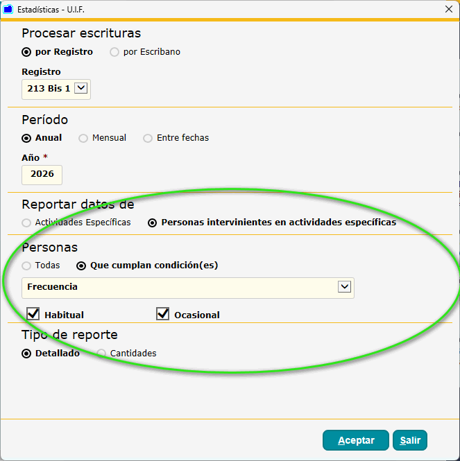 Estadísticas UIF:Esta versión agrega la posibilidad de generar reportes por interviniente seleccionado y por frecuencia de actividad (Habitual u ocasional).